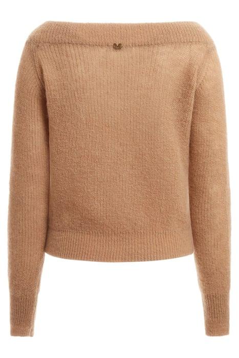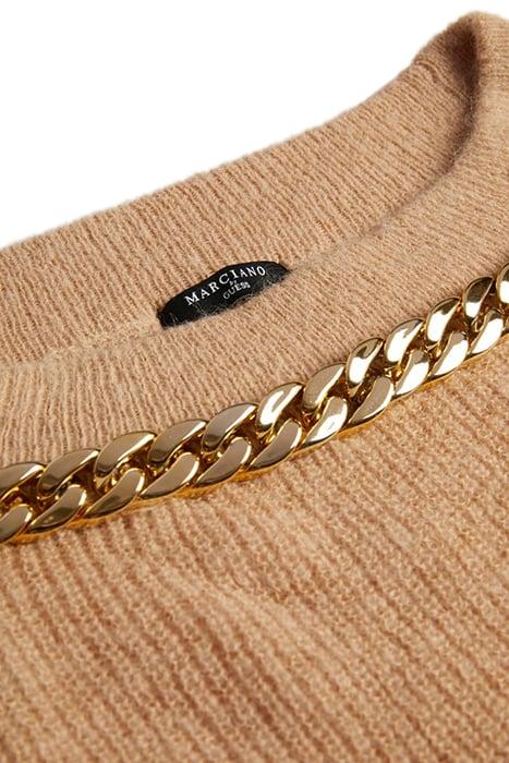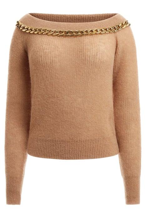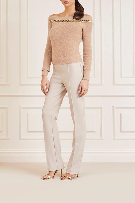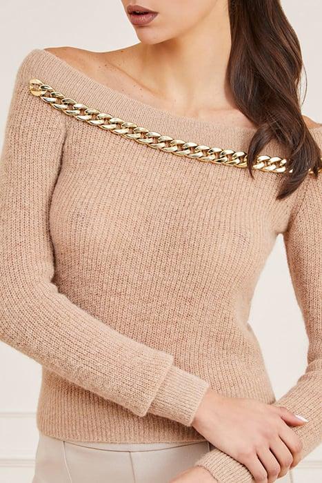 Elevate your wardrobe with the Nuvola Chain Off Nude Knitted Sweater Sand, a statement piece designed for modern elegance.