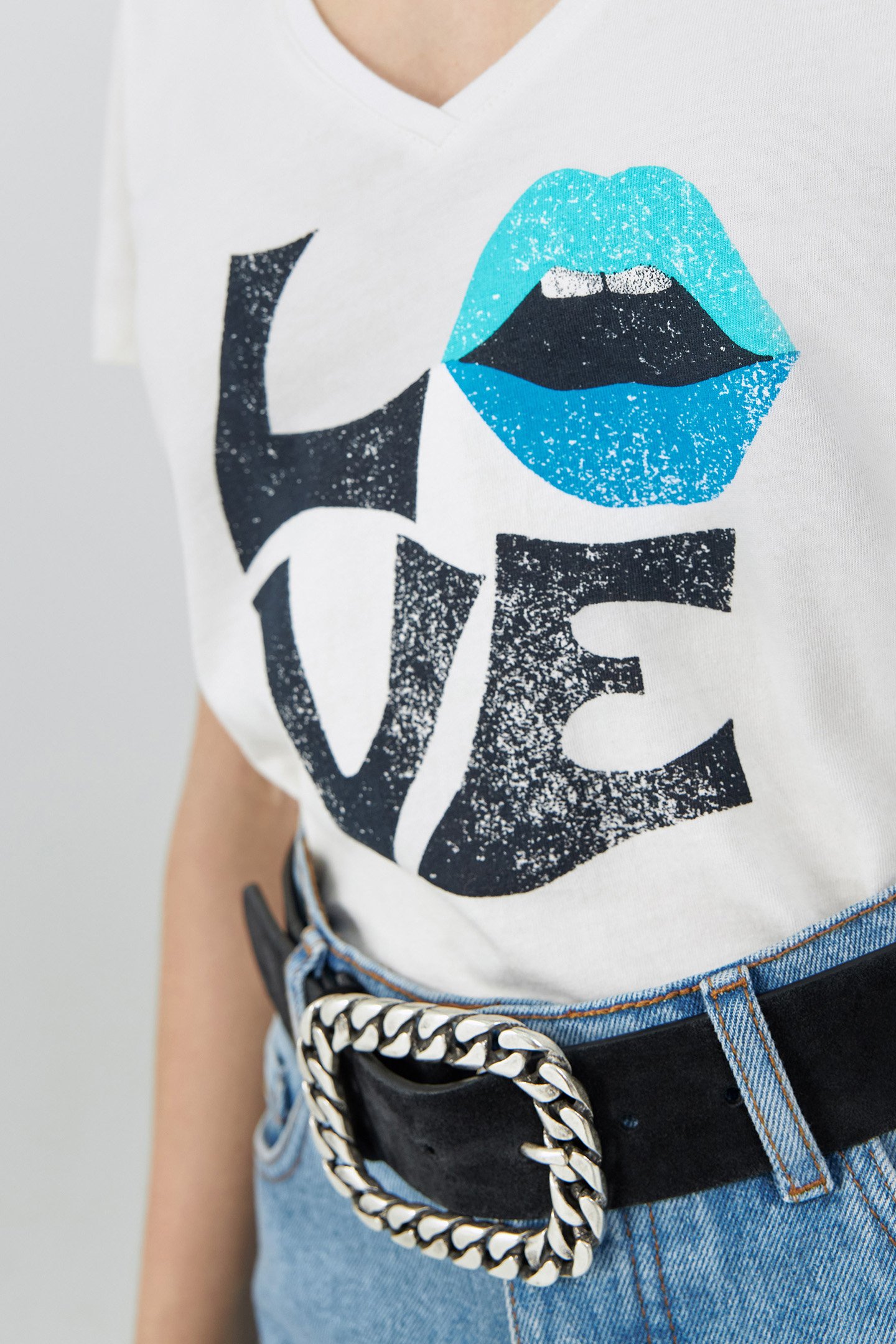 Silver Lips Replace The O In The Word Lover On This Off_White Pure Organic Cotton V_Neck T_Shirt.